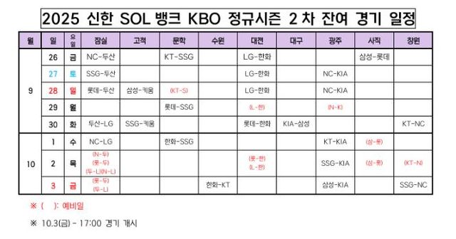KBO는 ‘경기가 우천 등으로 취소될 경우 발표된 일정의 예비일로 우선 편성되며 다음 날 동일 대진일 경우 더블헤더로 편성된다. 예비일이 없으면 추후 편성된다’라고 설명했다. 경기 개시 시간은 평일 오후 6시 30분, 토요일 오후 5시, 일요일 오후 2시이다. 또한 10월 3일 경기는 해당 구단의 전날 경기 후 이동을 고려해 오후 5시로 정했다.