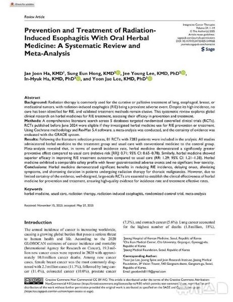 하재준 한의사 연구팀은 방사선 식도염 환자 7,283명의 임상연구 자료를 바탕으로, 한약을 복용한 치료군과 보편적 양방 대증치료만 받은 대조군을 구분해 체계적 문헌고찰로 예방·치료 효과를 비교했다.