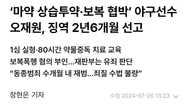 ‘마약 상습투약·보복 협박’ 야구선수 오재원, 징역 2년6개월 선고