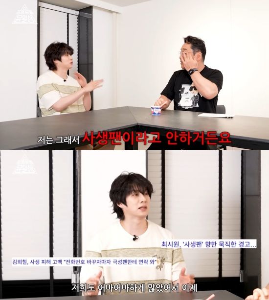 공개된 영상에서 김희철은 "저는 '사생팬'이라고 안 하고 '사생'이라고 한다. 사생이 정말 어마어마했다"며 "제가 차 타고 나오면 사생들이 차를 잡고서 우르르 따라오는 거다. 그러면 저는 가다가 골목 같은 데서 멈춰서 내린 다음에 문 두들기고 엄청 싸웠다"고 회상했다.