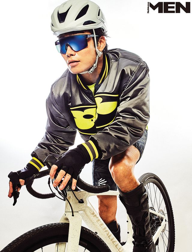 메탈릭 블루종 Louis Vuitton, 애시드 그린 티셔츠 Umbro, 커리 컬렉션 쇼츠 Under Armour, 실드 선글라스 Maui Jim, 모스트로 레더 부츠 Puma, 트레이닝 반장갑 lululemon, 광폭 타이어 터보 크리오 2 익스퍼트 e바이크와 헬멧 모두 Specialized.