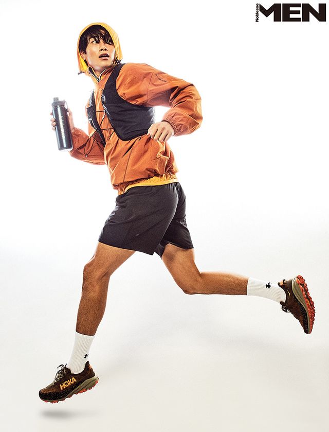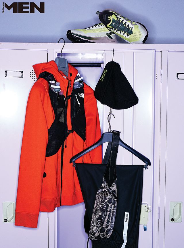 쏘맷 그린 러닝 슈즈 Descente, 오렌지 후드 집업 재킷과 바나 실크 벨트 백 모두 Herme`s, 선라이저 런 베스트 8 The North Face, 워터프루프 밴딩 팬츠 Rains, 로고 비니 Gucci.