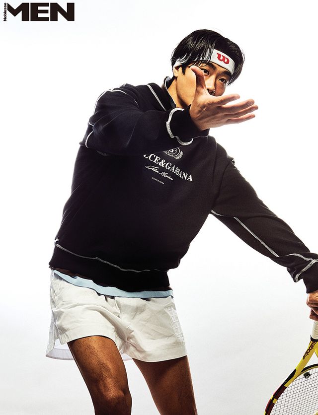 후드 스웨트셔츠 Dolce&Gabbana, 레이어링한 블루·브라운 폴로셔츠 모두 Aspesi, 화이트 쇼츠 Lacoste, 헤어밴드 Wilson, 라켓은 에디터 소장품.