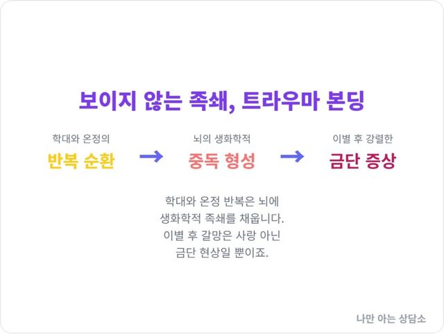 스트레스 호르몬인 코르티솔의 고통과, 쾌락 호르몬인 도파민의 안도가 반복되는 극단적인 경험은, 당신의 뇌가 고통의 근원에게 비이성적인 애착을 느끼도록 조건화했다.