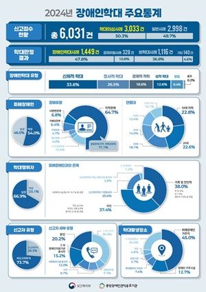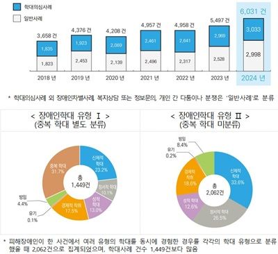 2024년 전국 장애인권익옹호기관에 접수된 장애인학대 관련 신고건수가 6,031건으로 전년 대비 9.7% 증가했고, 이 중 학대의심사례는 3,033건(50.3%)으로 조사됐다.