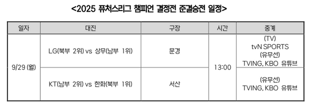 준결승 2경기는 모두 29일 오후 1시에 열리며, TVING과 한국야구위원회(KBO) 공식 유튜브 채널에서 생중계된다. 특히 문경에서 진행되는 LG와 상무의 경기는 스포츠 전문 채널 tvN SPORTS에서도 시청할 수 있다.