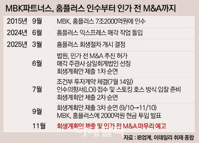 27일 투자은행(IB) 업계에 따르면 홈플러스는 회생계획안 제출 기한을 오는 11월 10일로 연기했다. 당초 홈플러스는 지난 6월로 예정된 회생계획안 제출 기한을 7월로 연기했고, 7월엔 9월로, 이달 들어선 11월로 총 세 번 기한을 연장했다. 회생계획안이 제출되기 전 성사돼야 할 ‘인가 전 M&A’가 마무리되지 않은 탓이다.