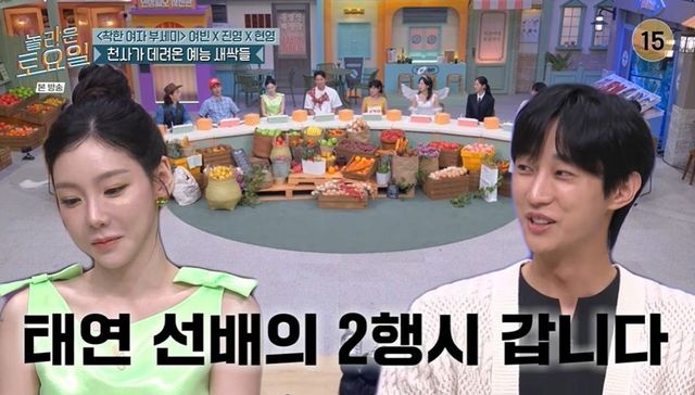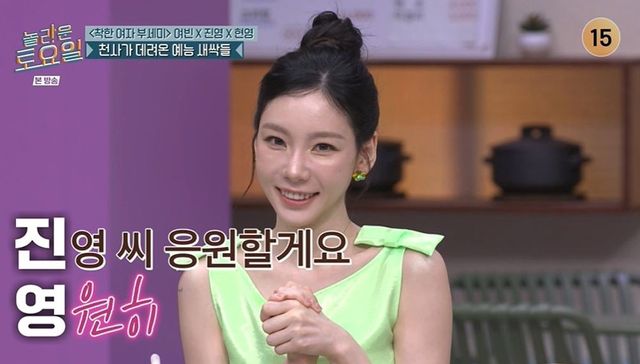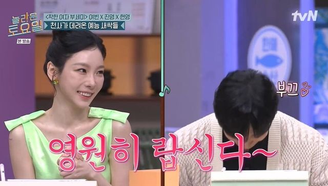 이를 지켜보던 피오는 태연에게 “‘진영’으로 2행시 해주던지”라고 던졌다. 태연은 “진영 씨 응원할게요, 영원히”라고 했고, 멤버들은 “영원히래”라고 놀렸다. 키는 “영원히 살 수가 없어”라며 현실적으로 말해 웃음을 안겼다.