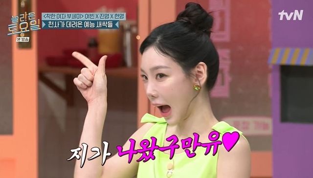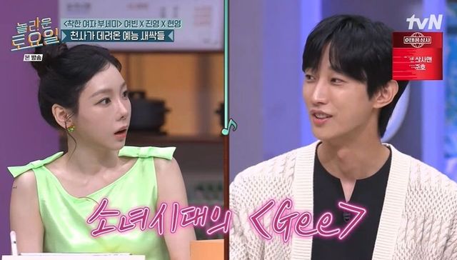 그런 가운데 붐은 “미담이 터졌다. 진영이 아이돌의 꿈을 갖게 한 사람이 이 자리에 있다고 한다”라고 말해 모두 기대했다. 진영이 말한 건 바로 소녀시대 태연. 진영은 “오디션 다닐 때 가장 많이 들은 노래가 ‘지(Gee)’였다. 노래 들으면서 연예인이 된다면 얼마나 행복할까 꿈꾸었다. 동경의 대상이었다”라고 팬심을 드러냈다. 이에 붐이 “‘지’가 옆에 나와 있다”라고 하자 태연은 ‘지’ 춤을 깜짝 선보이기도.