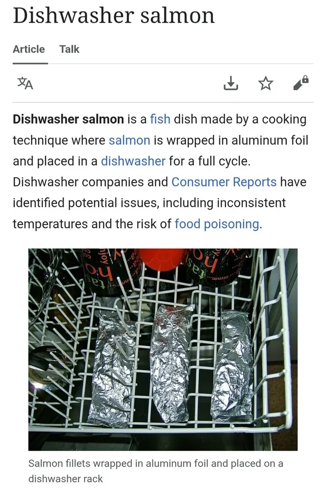 식기세척기가 고온으로 설거지를 하는 것에서 착안에 알루미늄 포일을 감싼 연어를 같이 넣고 돌려버리는 것.