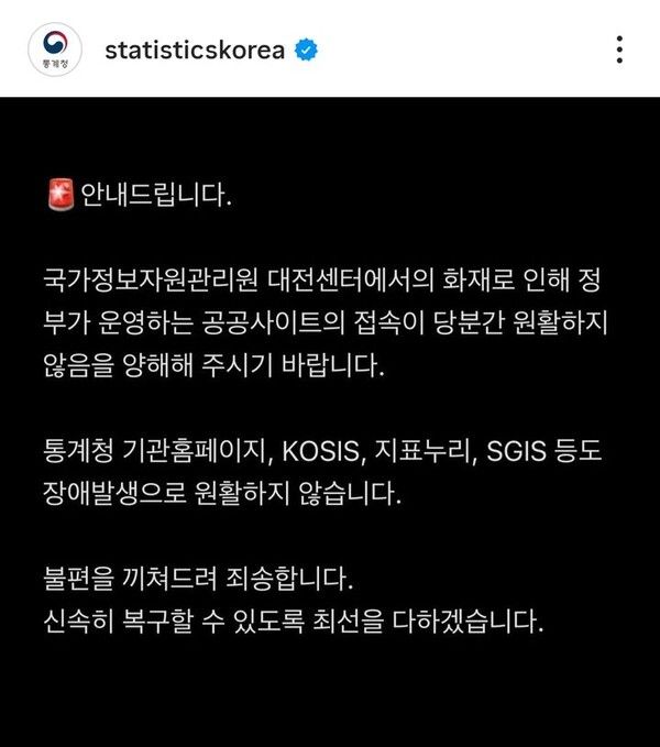 뉴시스 보도에 따르면, 통계청에 따르면 전날 발생한 국가정보자원관리원 화재로 인해 통계청 홈페이지와 국가통계포털(KOSIS), 통계데이터센터(SDC), 마이크로데이터(MDIS), 통계지리정보(SGIS) 등 주요 서비스가 중단된 상태다.