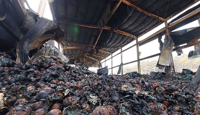 올해 3월 대형 산불이 발생한 경북의 한 창고에서 불에 탄 사과들이 흐트러져 있다. 기사 이해를 돕기 위한 자료 사진 / 연합뉴스