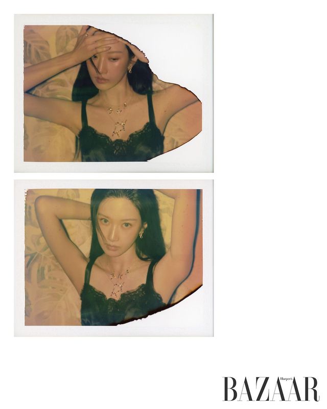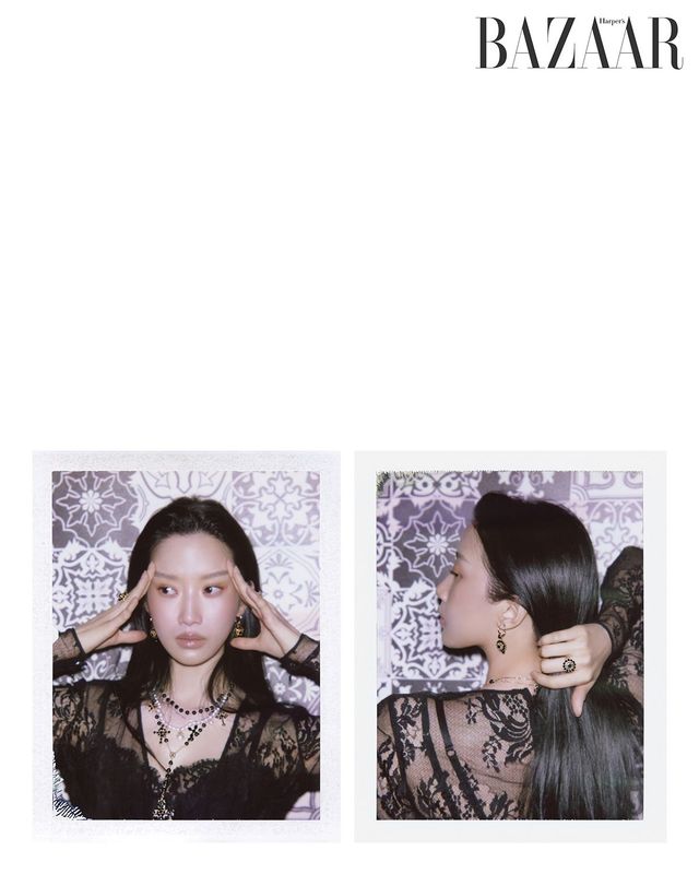 드롭 귀고리, 오른손 중지에 착용한 반지는 ‘트레디션’ 컬렉션, 다양한 참 장식이 돋보이는 목걸이, 레이어드한 십자가 장식 드롭 목걸이, 왼손 검지에 착용한 반지는 ‘데보션’ 컬렉션, 레이스 드레스는 8백25만원 모두 Dolce & Gabbana.