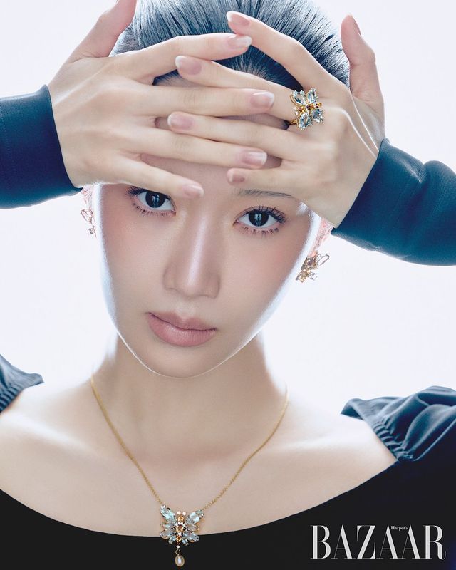 나비 모티프의 귀고리, 목걸이, 반지는 ‘스프링・버터플라이’ 컬렉션, 드레스는 3백만원 모두 Dolce & Gabbana.