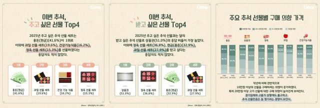 명절 선물 계획을 묻는 질문에서는 용돈이 41.6%로 가장 많았다. 이어 과일이 19.6%, 건강기능식품이 16.2%, 정육이 15.3%, 상품권이 14.2%로 나타났다. 반면 받고 싶은 선물은 상품권이 51%로 가장 많았고 정육 36.8%, 용돈 32.9%, 과일 27.9% 순이었다. 용돈은 1인당 평균 10만~20만 원이 40.4%로 가장 많았고 20만~30만 원이 27.9%, 5만~10만 원이 13.9%였다. 선물세트 지출은 지난해보다 10만 원 이상 혹은 20만 원 이상의 고가 선물 구매 의향이 높아졌고 가격 외에는 실용성, 브랜드 신뢰도, 상품 구성이 주요 고려 요소로 꼽혔다.