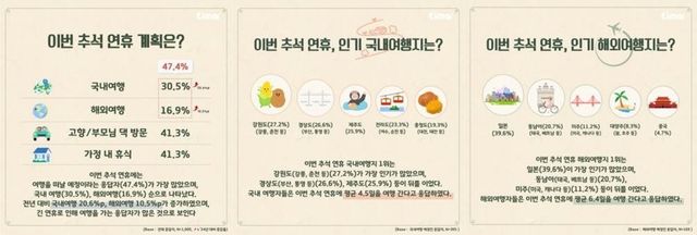 국내 인기 여행지는 강원도가 27.2%로 가장 많았고 이어 경상도가 26.6%, 제주도가 25.9%였다. 해외여행은 일본이 39.6%로 가장 높았으며 동남아가 20.7%, 미주 지역이 11.2%였다. 여행 기간은 추석 연휴를 포함해 국내여행은 평균 4.5일, 해외여행은 평균 6.4일이었다. 여행을 계획하지 않은 이유로는 성수기라 사람이 많을 것 같다는 답변이 38%로 가장 많았고 경제적 부담이 크다는 응답이 33.1%, 고향 방문이 필요하다는 응답이 30.7%였다.