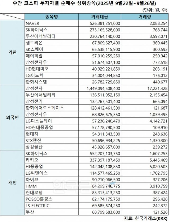 기관 'NAVER'·외인 '삼성전자'·개인 'SK하이닉스' 1위 [주간 코스피 순매수- 2025년 9월22일~9월26일]
