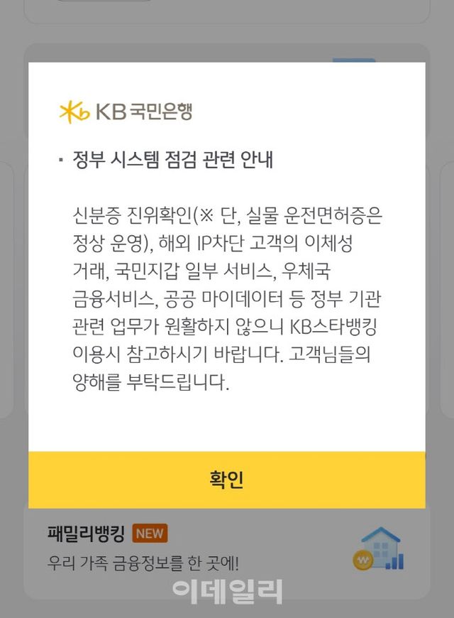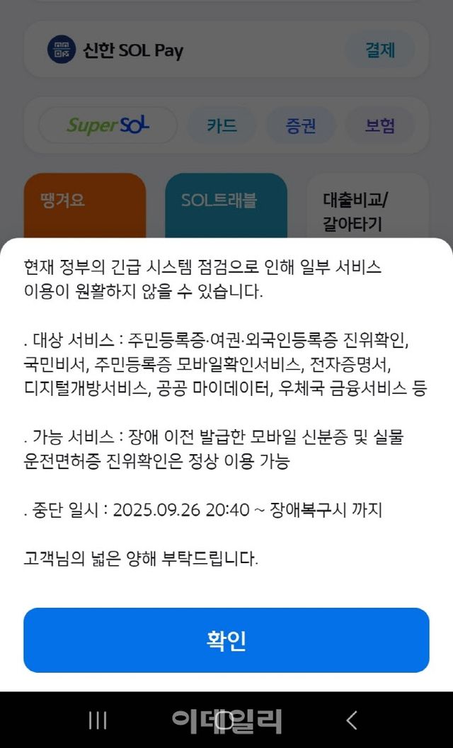 초유의 행안부 시스템 마비에 각 금융사들은 위기대응체계를 가동하고 있다. 각 은행과 금융그룹은 26일 저녁부터 홈페이지와 모바일 앱을 통해 운전면허증 등 대체 인증 수단을 안내하고 있다.