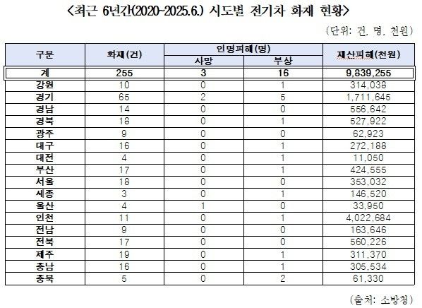2020년부터 올상반기까지 집계된 전기차 화재는 총 255건이며, 이로 인해 사망 3명·부상 16명이 발생했고 재산피해액은 98억 3,925만 원에 달했다.