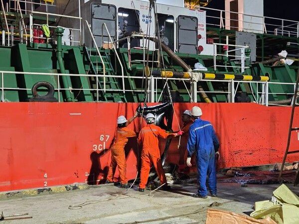 A호에서 아스팔트를 육상 차량으로 옮기는 작업을 하던 중 호스가 찢어져 일부 유출된 것으로 해경은 파악하고 있다.