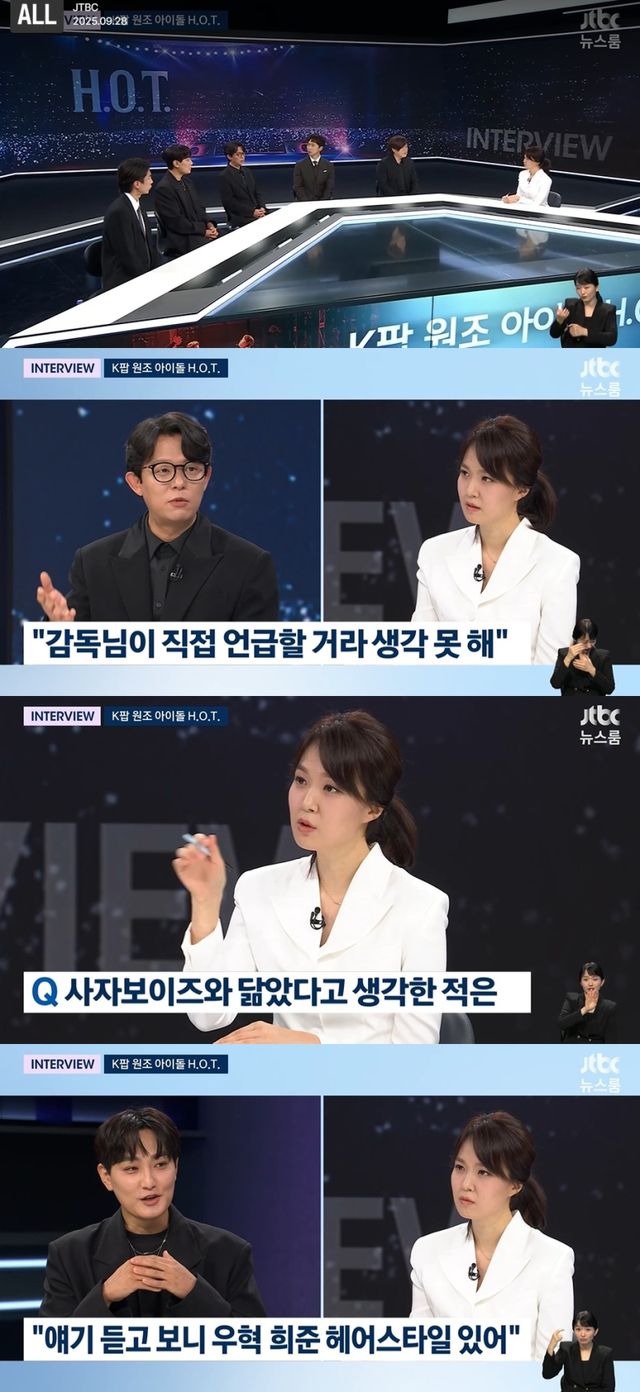 28일 오후 방송된 JTBC ‘뉴스룸’에는 문희준, 토니안, 장우혁, 강타, 이재원이 완전체로 출연해 7년 만의 동반 방송 소감을 전했다. 멤버들은 데뷔 초창기 인사를 재현하며 추억을 떠올렸고, 진행을 맡은 안나경 앵커는 “‘케이팝 데몬 헌터스’ 메기 강 감독이 H.O.T.에서 영감을 받아 사자보이즈를 만들었다고 밝혔다”고 질문을 던졌다.