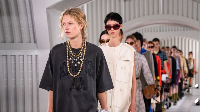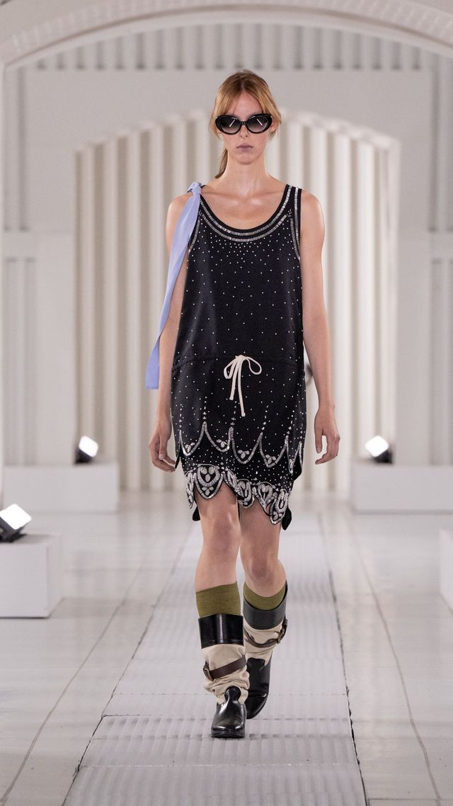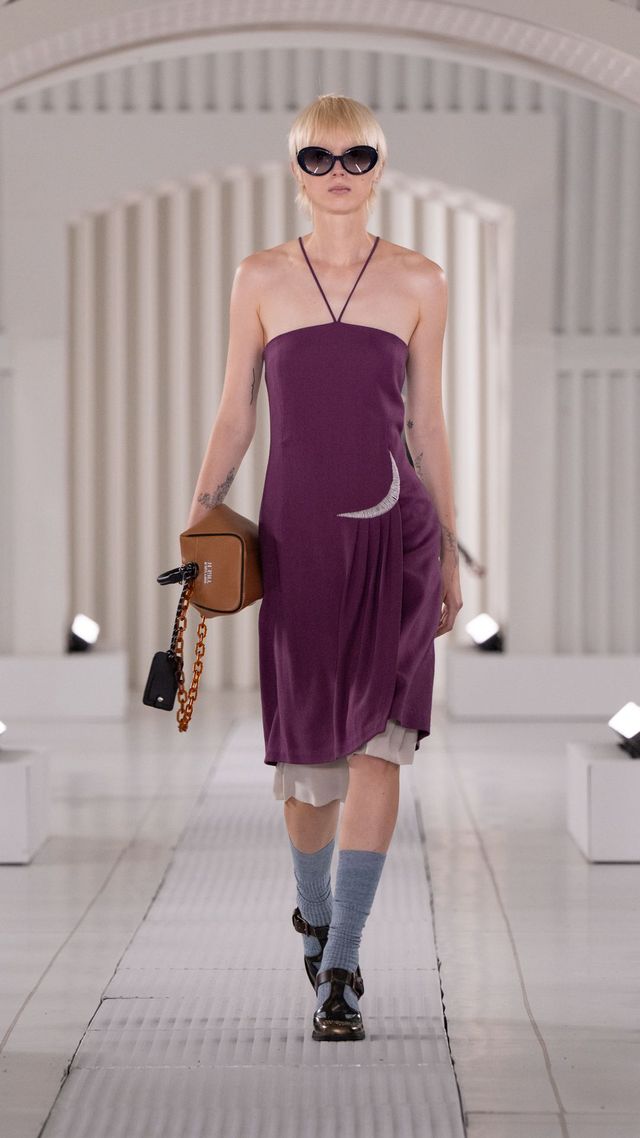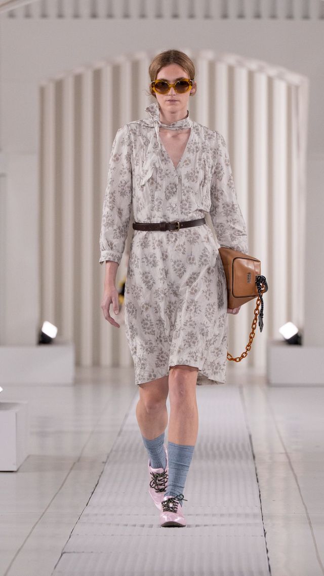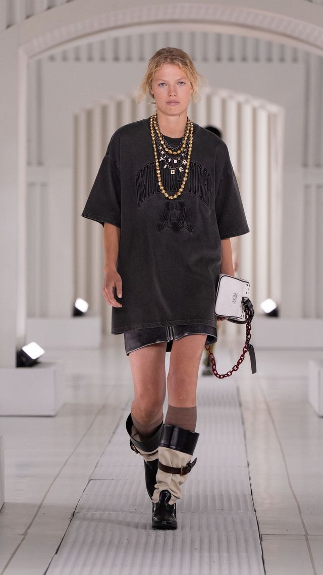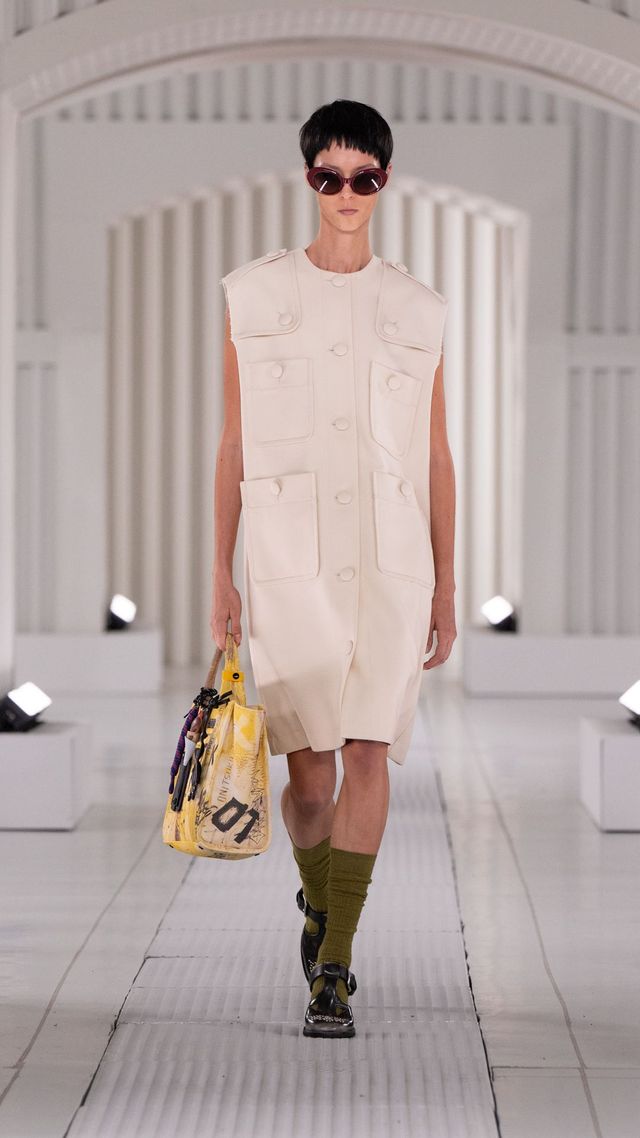 런웨이에서는 대비의 향연이 펼쳐졌습니다. 주름진 셔츠, 블라우스, 드레스가 빈티지한 무드를 자아낸 한편 바디 수트에서 영감을 받은 드레스는 볼륨감 있는 큘롯 팬츠와 레이어드되어 의외의 비대칭 실루엣을 완성했습니다. 얇고 뻣뻣한 소재의 파카는 스트라이프 니트 탱크 톱과 쇼츠, 프릴 디테일 허리선이 강조된 크롭 트러커 재킷과 조화를 이루었죠. 가죽 소재의 오버사이즈 바이커 재킷과 미니 바이커 스커트도 눈길을 끌었고요. 스웨이드 소재는 비대칭 플리츠 스커트와 매치된 바시티 스타일 재킷으로 등장했습니다. 한편 네오프렌과 프린트 나일론으로 만든 리버서블 오버사이즈 스웨트셔츠와 후디, 장미와 데이지 프린트가 가미된 퀼팅 재킷은 1980년대 핑크 팔레트에서 영감을 받아 플로럴 감성을 더했습니다.