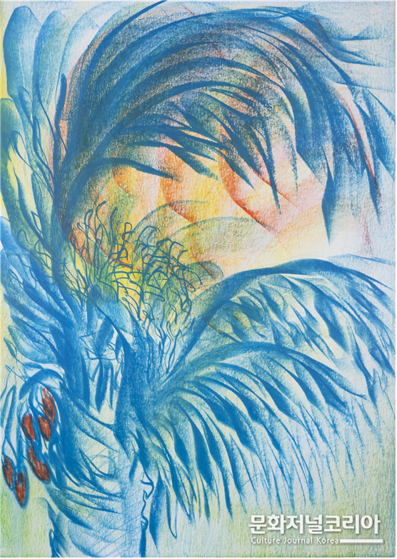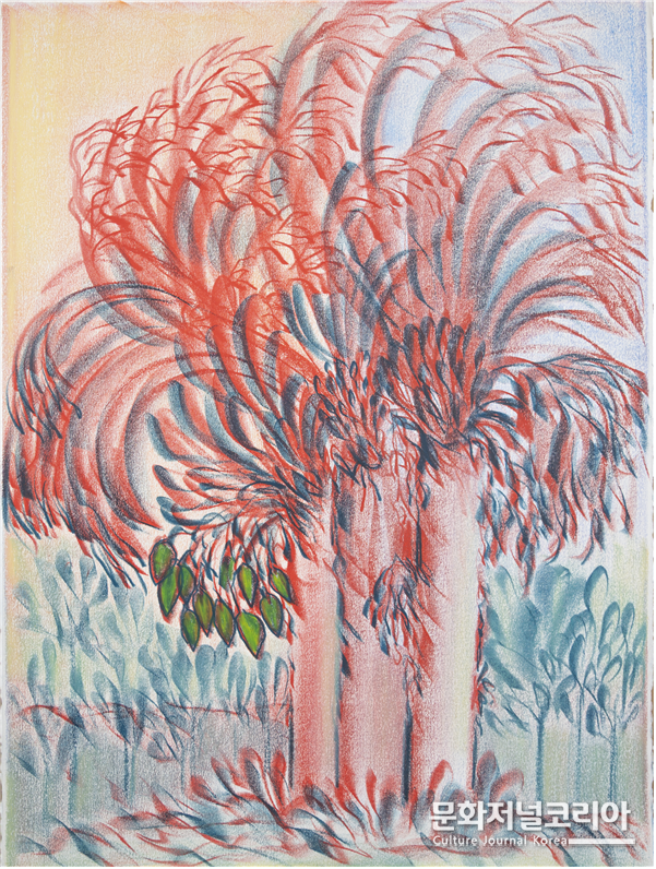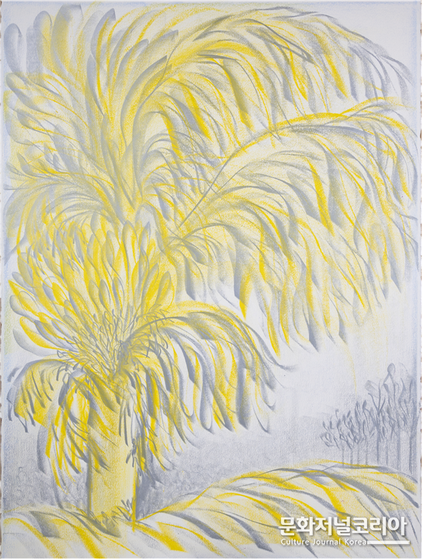 작가의 화면 속 나무는 단순한 풍경을 넘어 존재와 생명의 은유로 자리한다. 바람 속에서도 꿋꿋이 선 종려나무의 형상은, 인간이 삶의 역경을 견디며 강인하면서도 유연하게 살아가는 모습을 담아낸다. 그 속에서 나무는 환희와 시련, 고요와 치유를 함께 품은 상징적 존재로 확장된다.