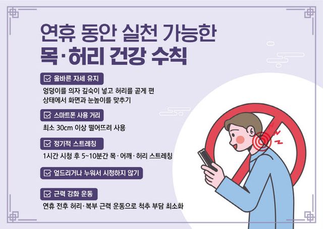 바른세상병원 척추센터장 이학선 원장은 “연휴 동안 장시간 TV나 스마트폰을 시청할 경우, 누워서 보는 자세는 허리와 목에 불필요한 부담을 주므로 피해야 한다. 대신 의자에 앉아 시청할 때는 엉덩이를 의자 깊숙이 넣고 허리를 곧게 편 상태에서 화면을 눈높이와 맞추는 것이 중요하다. 가능하다면 1시간 시청 후에는 5~10분 정도 일어나 몸을 움직이거나 목ㆍ어깨 스트레칭이나 가벼운 걷기는 해주는 것이 도움이 된다”고 조언했다.