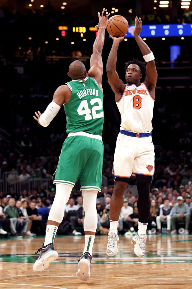 BOSTON, MASSACHUSETTS - MAY 07: OG Anunoby #8 of the New York Knicks attempts a shot against Al Horford #42 of the Boston Celtics during the first quarter in Game Two of the Eastern Conference Second Round NBA Playoffs at TD Garden on May 07, 2025 in Boston, Massachusetts. NOTE TO USER: User expressly acknowledges and agrees that, by downloading and or using this photograph, User is consenting to the terms and conditions of the Getty Images License Agreement. Maddie Meyer/Getty Images/AFP (Photo by Maddie Meyer / GETTY IMAGES NORTH AMERICA / Getty Images via AFP)/2025-05-08 08:15:37/