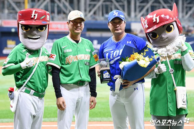 오승환은 설종진 키움 감독으로부터 자신의 트레이드 마크인 돌직구를 형상화한 트로피와 키움을 상대로 달성한 아시아 단일리그 최다 세이브를 기록했던 순간이 담긴 사진 액자를 선물로 전달받았다.