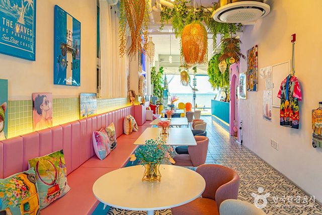 방아머리해변에는 화려한 외관으로 오가는 이들의 눈길을 사로잡는 카페, 카캉스가 있다. 문을 열고 들어가면 야자수 장식과 파스텔 색조의 가구, 해변 도시의 감성을 살린 소품들과 통창 너머로 펼쳐지는 바다 풍경이 또다시 발길을 붙잡는다. 문 하나를 열고 들어갔을 뿐인데 마치 동남아 휴양지에 온 듯한 기분이 든다.