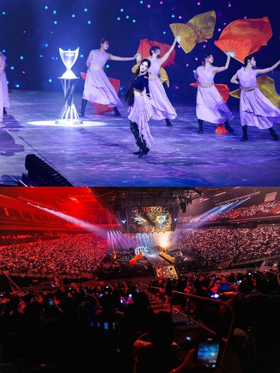 'Here, Tomorrow' 무대에서는 민주의 매력적인 음색이 빛을 발했다. 무대 바닥까지 이어진 LED 영상과 AR로 구현한 LoL 스토리 상징물, 관객석을 가득 메운 응원봉 불빛이 어우러지며 더욱 생동감 있는 무대가 펼쳐졌다. 여기에 결승전에 오른 두 팀을 소개하는 대규모 스케일의 부채 퍼포먼스까지 이어지면서 현장 분위기는 최고조에 이르렀다.