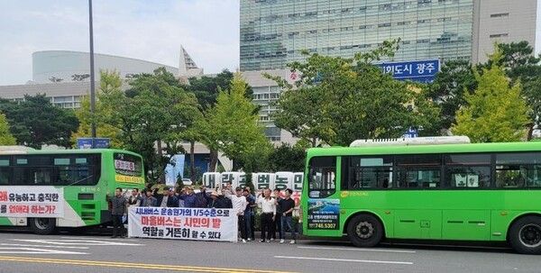 뉴시스 보도에 따르면, 광주시 마을버스 운송조합(나라교통·나라버스·광남운수·석봉운수·광산버스)은 29일 오전 광주 서구 광주시청 앞에서 '즉각적 버스요금 현실화 및 마을버스 시구매칭 적자보전' 집회를 열고 "적자 보전 대책을 세워야 한다"며 이 같이 밝혔다.