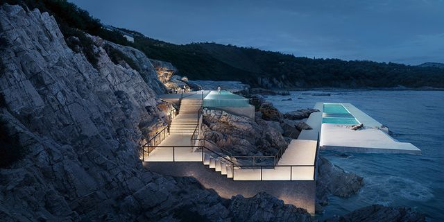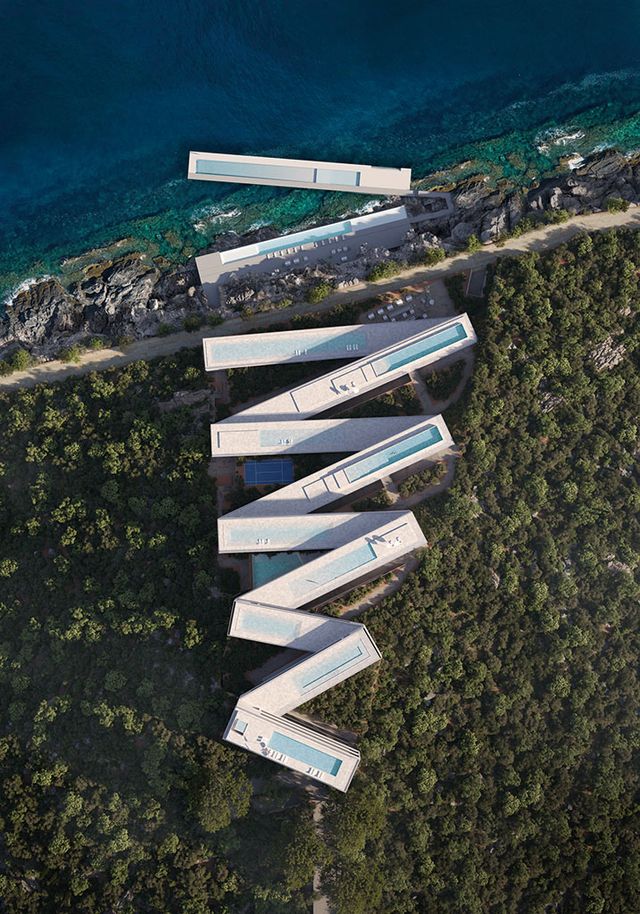 리조트는 가파른 절벽 경사를 따라 ‘지그재그’ 형태로 배치된다. 각 유닛이 다른 유닛의 시야를 가리지 않아 모든 투숙객이 탁 트인 전망을 누릴 수 있다. 직선으로 뻗은 테라스와 수영장은 바다와 산세를 한 화면에 담으며 건축과 자연을 유려하게 이어주며, 인피니티 풀은 해안선과 시각적으로 맞물려 바다와 이어지는 듯한 착각을 일으킨다. 동선은 직관적이고 간결하다. 테라스, 정원, 수영장을 오가는 수직 이동은 끊김 없는 보행로와 경사형 케이블카(푸니쿨라)가 맡아, 지형 훼손없이 층간 접근성을 높인다. 외벽은 현지에서 조달한 베라트 석재로 마감했는데, 내구성이 강한 이 돌은 자연스레 변색·풍화되어 시간이 흐를수록 건물과 땅이 조화롭게 어우러지는 풍경을 만든다.