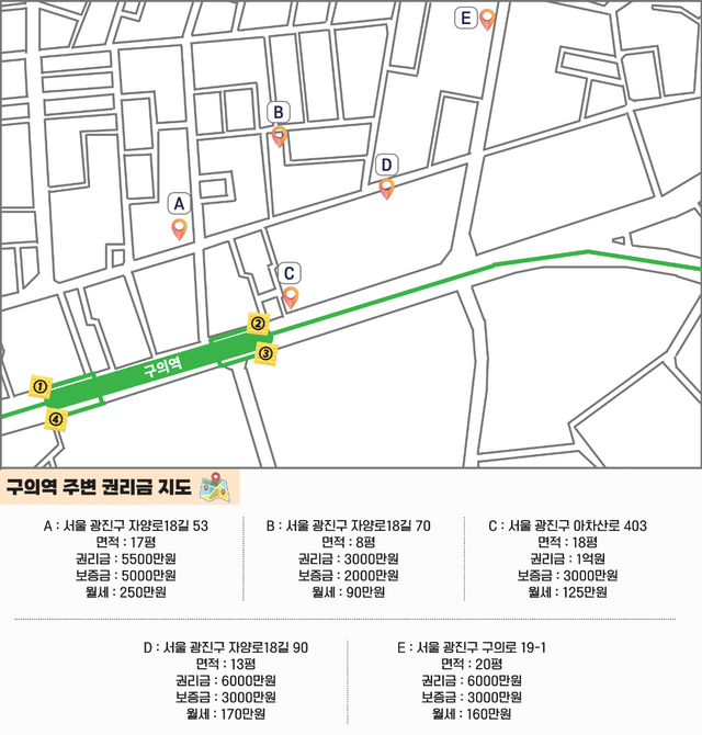 구의로 19-1에 위치한 20평 규모 매물은 권리금 6000만원, 보증금 3000만원, 월세 160만원에 책정됐지만 이스트폴과 다소 거리가 있어 권리금이 상대적으로 낮게 형성됐다. 구의역과 가까운 거리에 있는 상가 중 권리금이 상대적으로 저렴한 곳도 있다. 자양로18길 70에 위치한 8평 규모 매물은 초기 권리금이 7000만원이었으나 현재 3000만 원까지 낮아졌다. 보증금 2000만원, 월세 90만원으로 상대적으로 저렴하지만, 업종 선택에 따라 경쟁력이 갈릴 수 있다는 설명이다.