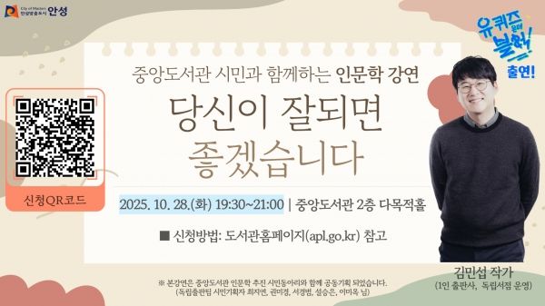 안성시는 오는 10월 28일 저녁 7시 30분, 중앙도서관 다목적홀에서 정미소출판사 대표이자 『당신이 잘되면 좋겠습니다』의 저자 김민섭 작가를 초청해 시민 강연회를 개최한다.