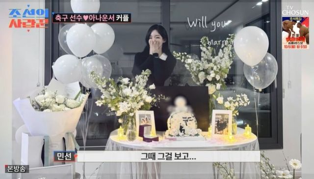 지난 5월, 송민규는 골을 넣은 후 프러포즈 세리머니를 했다고. 곽민선은 “전 방송 중이라 아예 몰랐다. 행사 끝나고 팬분들과 있는데, ‘결혼하냐’고 하시더라. 회사랑 친구들한테 전화가 엄청 와 있었다. 세리머니한 날 인터뷰까지 했더라”면서 “다음 날 민규 집에 갔는데, 꽃이 가득했다. 정식 프러포즈를 또 준비한 거다. 그걸 보고 사사로운 걱정들이 녹았다”라고 고백했다.