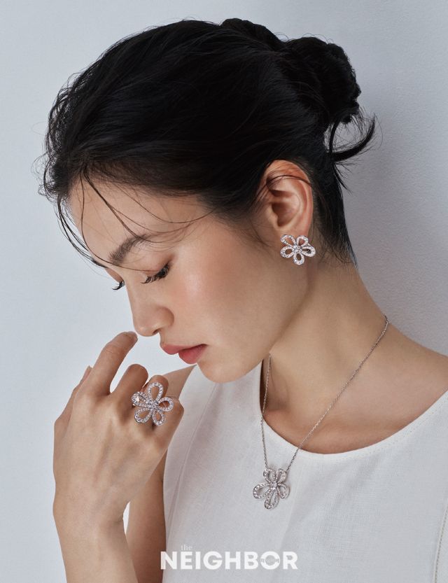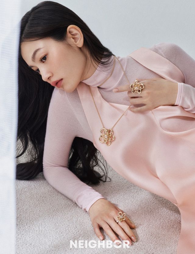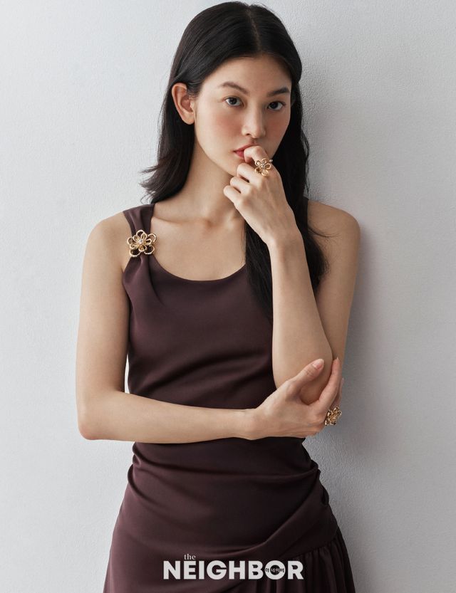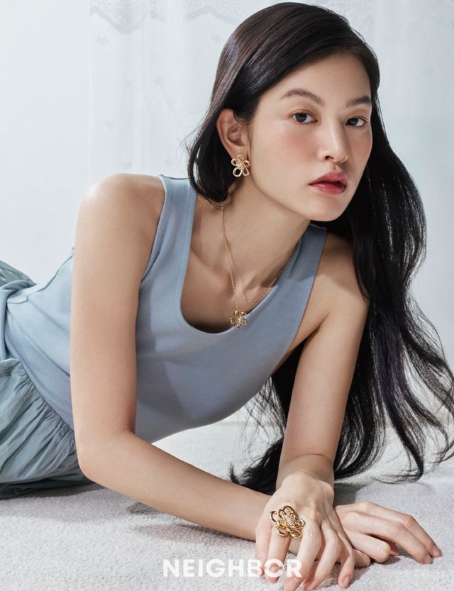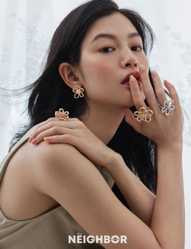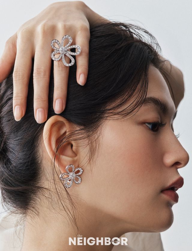 18K 옐로 골드에 다이아몬드를 세팅한 플라워레이스 이어링, 왼손 검지에 착용한 비트윈 더 핑거 링, 오른손 검지에 착용한 링, 약지에 착용한 18K 화이트 골드 플라워레이스 하이 주얼리 컬렉션 링 모두 가격 미정.