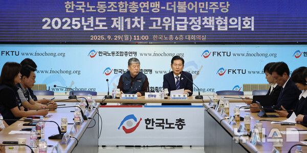 한편 이날 김동명 한국노총 위원장은 "(이재명 정부) 집권 이후 바로 노조법 2·3조 개정(노란봉투법)이라는 오랜 숙원이 결실을 맺었고 현 정부는 노동현장에서 발생하는 산업재해 문제를 해결하기 위해 노력하고 있다"며 "정책협약 이행의 첫 걸음이 의미있게 시작되고 있다고 생각한다"고 말했다.