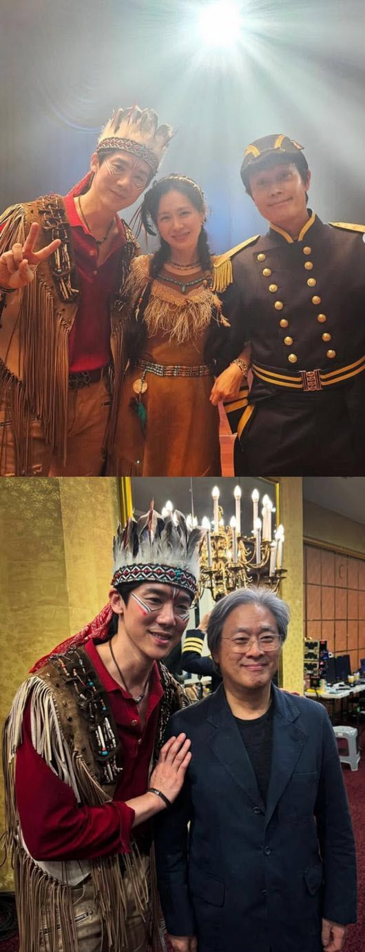 사진 속 유연속은 인디언 분장을 한 채 손예진, 이병헌과 포즈를 취하고 있다. 또 같은 분장을 한 채 박찬욱 감독과 함께 찍은 투샷 사진도 함께 공개했다.