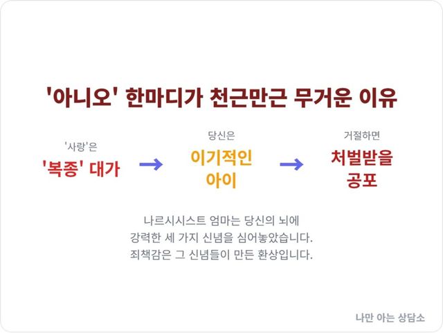 이 과정에서 당신의 무의식에는 ‘복종 = 사랑’, ‘거절 = 배신’이라는 치명적인 공식이 각인된다.