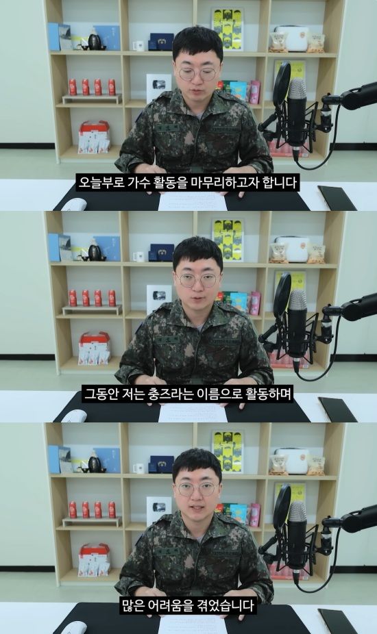 최근 충주시 공식 유튜브 채널에 '드릴 말씀이 있습니다'라는 제목의 영상이 게재되었다. 군복을 입고 등장한 충주맨(충즈)은 "고민 끝에 저는 오늘부로 가수 활동을 마무리하고자 한다"고 밝혔다.