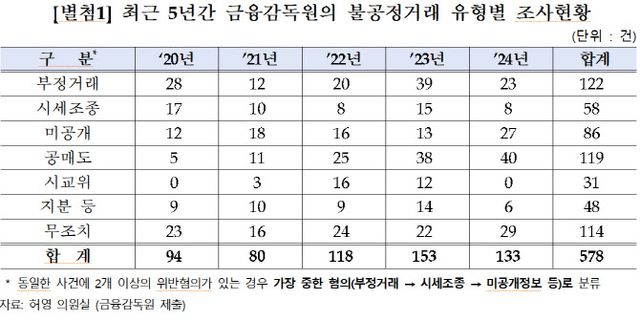 29일 국회 정무위원회 소속 허영 더불어민주당 의원이 금융감독원으로부터 제출받은 자료에 따르면, 금융감독원은 같은 기간 거래소로부터 578건의 ‘이상거래’ 의뢰를 받아 조사했으며 이 가운데 464건을 불공정거래로 확인했다.