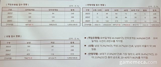 한국소비자원에 접수되는 게임 피해구제 신청 건수는 점점 증가하는 추세다. 2022년에는 248건에 불과했으나, 2023년에는 288건, 2024년에는 519건에 달한다. 플랫폼에서는 모바일게임이 65.1%를 차지했다. 연령으로는 30대가 37.6%로 가장 많았고, 40대가 26.4%, 20대가 22% 순이다. 20대에서 40대가 차지하는 비중은 86%다. 성별 기준으로는 남성 비중이 75.3%였다.
