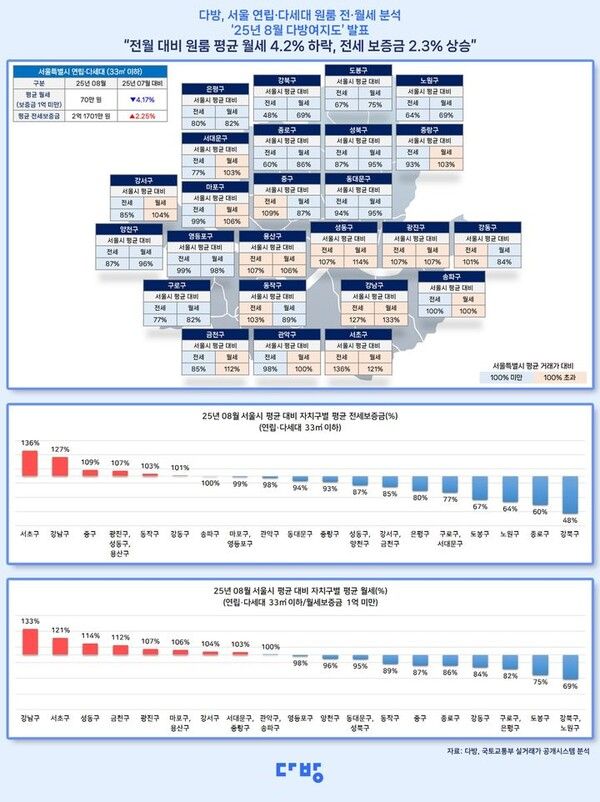 뉴시스 보도에 따르면, 30일 부동산 정보 플랫폼 '다방'은 지난달 기준 서울 지역의 전용면적 33㎡ 이하 연립·다세대 원룸의 25개 자치구별 전·월세 수준을 분석한 '8월 다방여지도'를 통해 이같이 밝혔다.