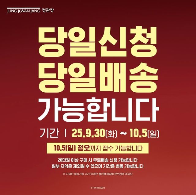 [프라임경제] KGC인삼공사가 추석 연휴를 앞두고 정관장 '당일신청·당일배송' 서비스를 운영한다고 30일 밝혔다. 기간은 9월30일부터 10월5일 정오까지다.