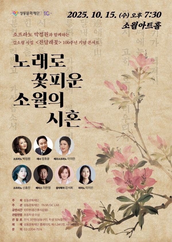 재단법인 성동문화재단은 기념공연 ‘노래로 꽃피운 소월의 시혼(詩魂)’을 10월 15일(수) 19시 30분 소월아트홀에서 개최한다고 밝혔다. 소월아트홀은 김소월 시인이 왕십리에서 하숙하며 창작 활동을 이어간 인연을 기려 그의 호를 딴 공간이다.