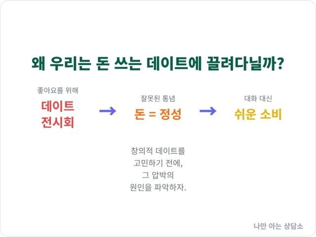 창의적인 데이트를 고민하기에 앞서, 우리가 왜 ‘돈 쓰는 데이트’의 압박에서 벗어나지 못하는지 그 원인을 알아볼 필요가 있다.