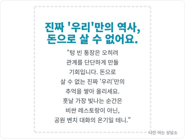 20대의 텅 빈 통장은 당신의 가난이 아니라, 오히려 당신들의 관계를 더 단단하게 만들 기회다. 돈으로 쉽게 살 수 있는 편리함 대신, 두 사람의 시간과 아이디어, 정성을 쏟아부어 추억을 만들어가는 과정.