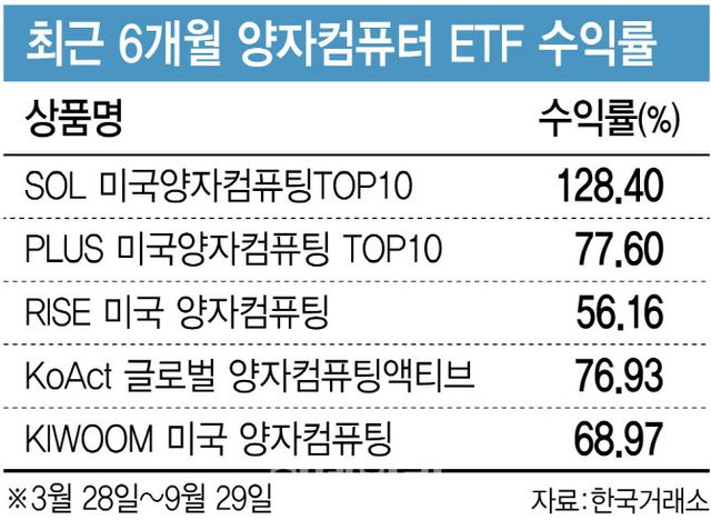 30일 한국거래소에 따르면 전체 상장 ETF 중 최근 6개월 간(3월 28일~9월29일) 가장 많이 오른 ETF는 신한자산운용의 ‘SOL 양자컴퓨팅 TOP10’ ETF로 파악됐다. 이 기간 수익률 128%로 전체 상장 ETF 중 1위를 기록했다.